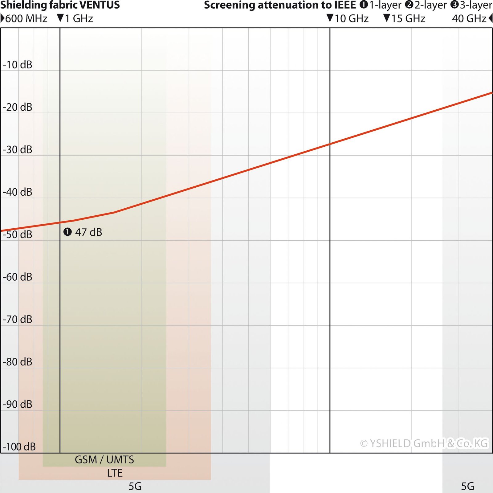 Este producto protege frente a campos electromagnéticos de alta frecuencia (HF). A menos que se indique lo contrario, los valores en dB se refieren a 1 GHz. Medición de 600 MHz a 40 GHz según normas ASTM D4935-10 o IEEE Std 299-2006.